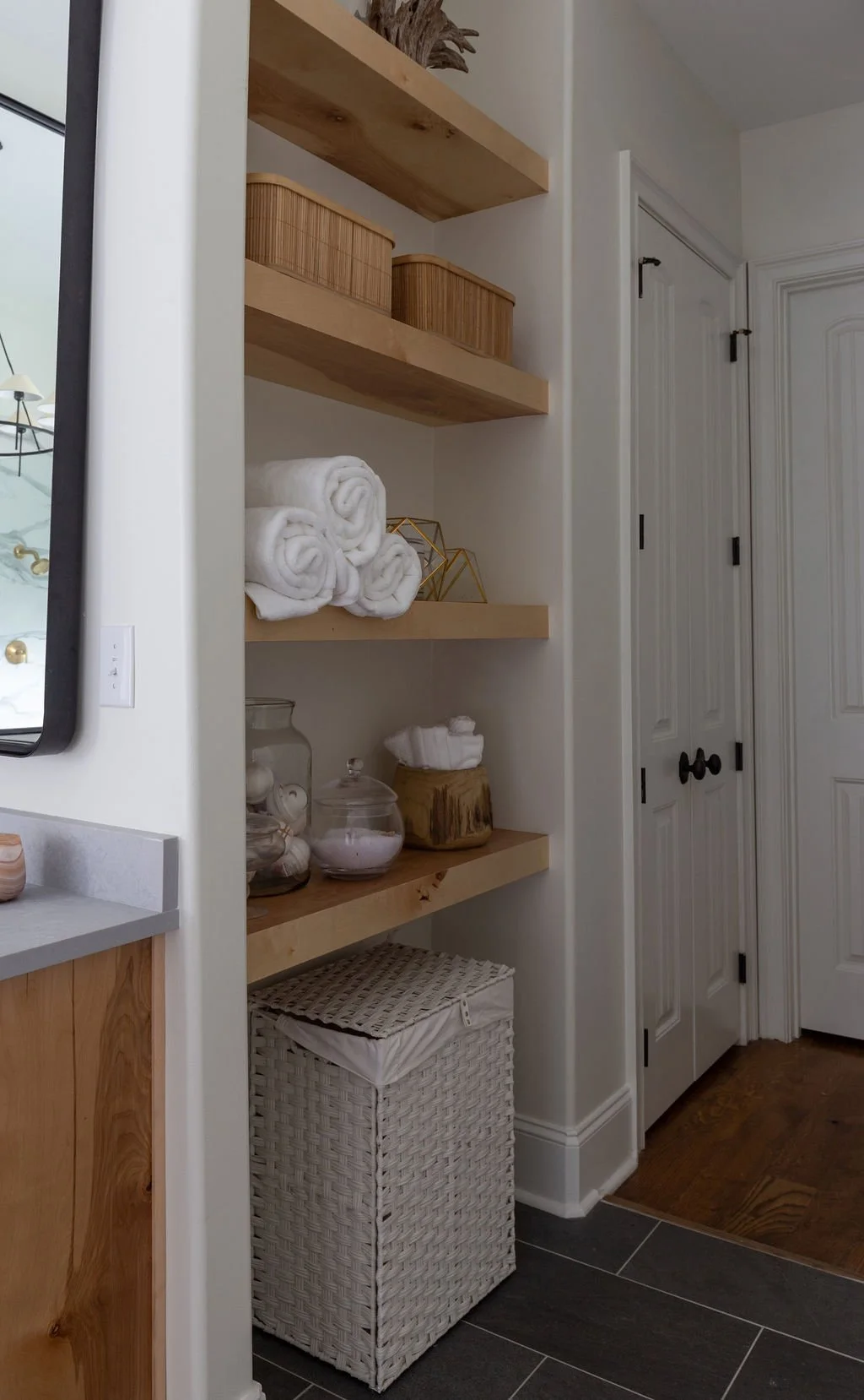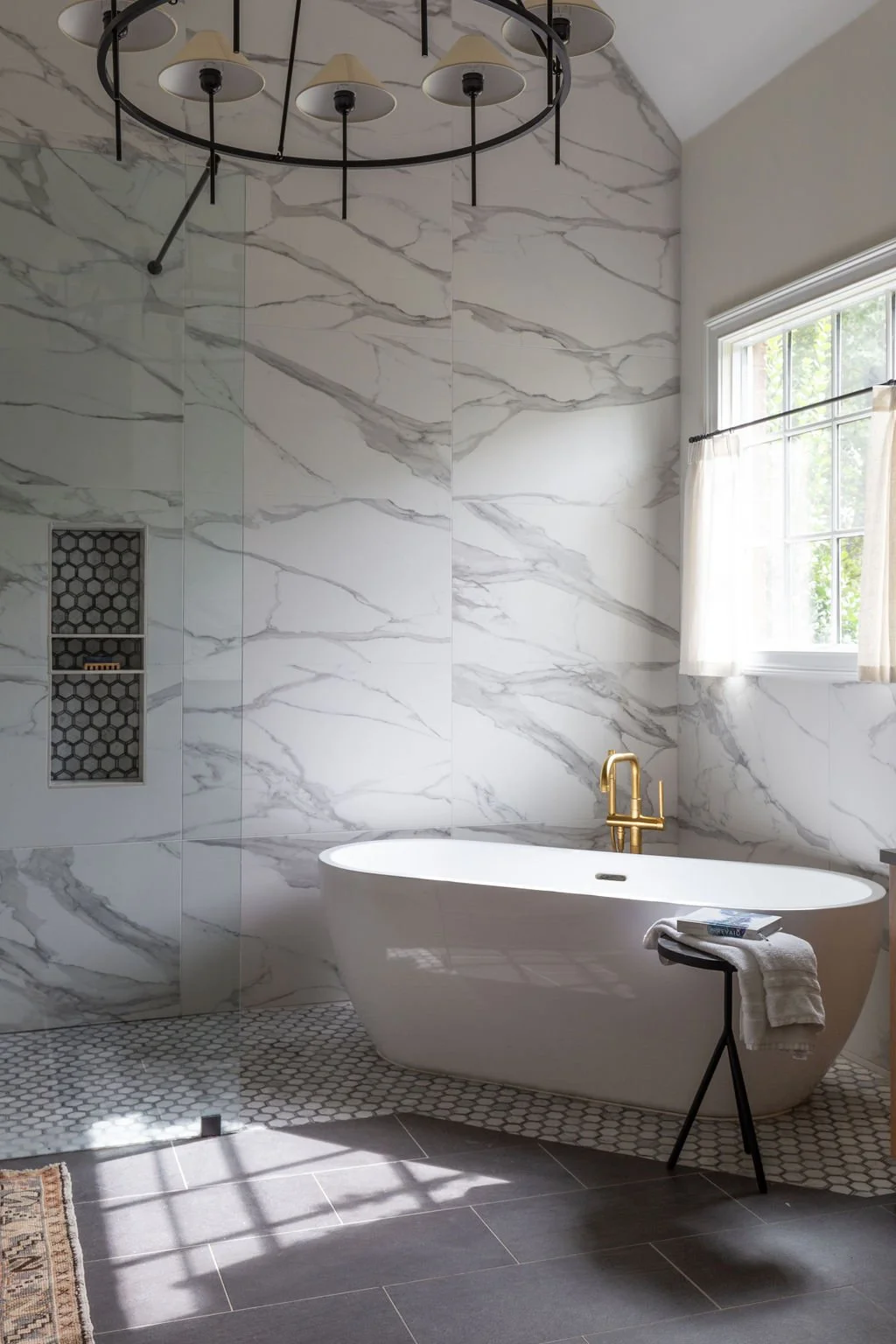 In the 2nd phase of a whole-home renovation, this massive primary bath hadn’t been updated since the home was built in the early 2000s. With 20 ft. ceilings and beautiful natural light, Maggie instantly saw such beautiful potential. Gutting the bathroom down to the studs, taking large-scale tile all the way to the ceiling, and bringing in modern, yet classic elements led to magazine-worthy results.